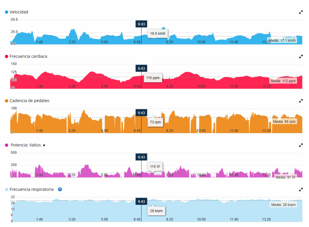 En este Ejercito mío en bici, esta echo en 7 kilómetros y al empezar a hacerlo, los picos de potencia son más altos y la frecuencia cardiaca se recupera más o antes, que en la parte final, divido a que los cromosomas y genes neuronales, quedan bloqueados por contaminación.
